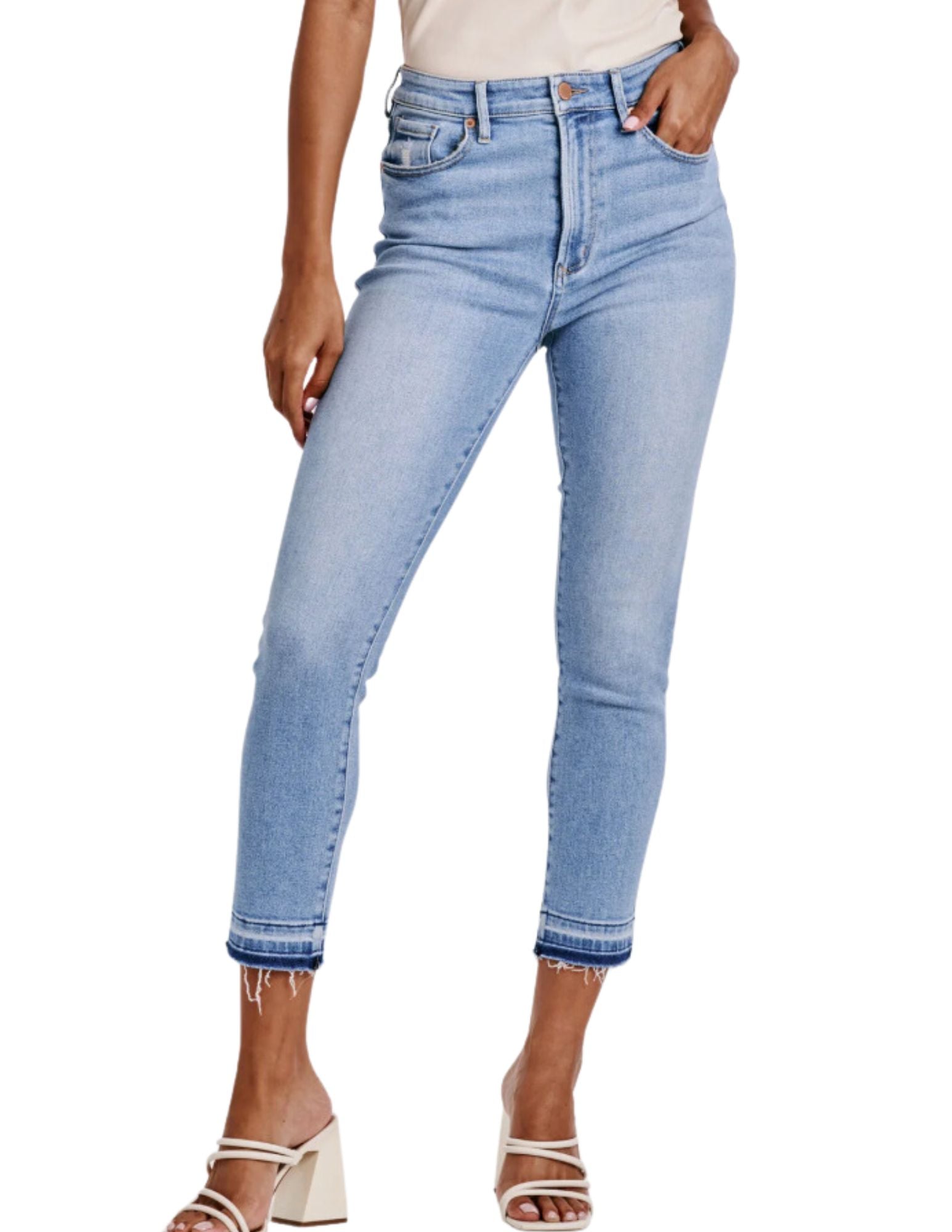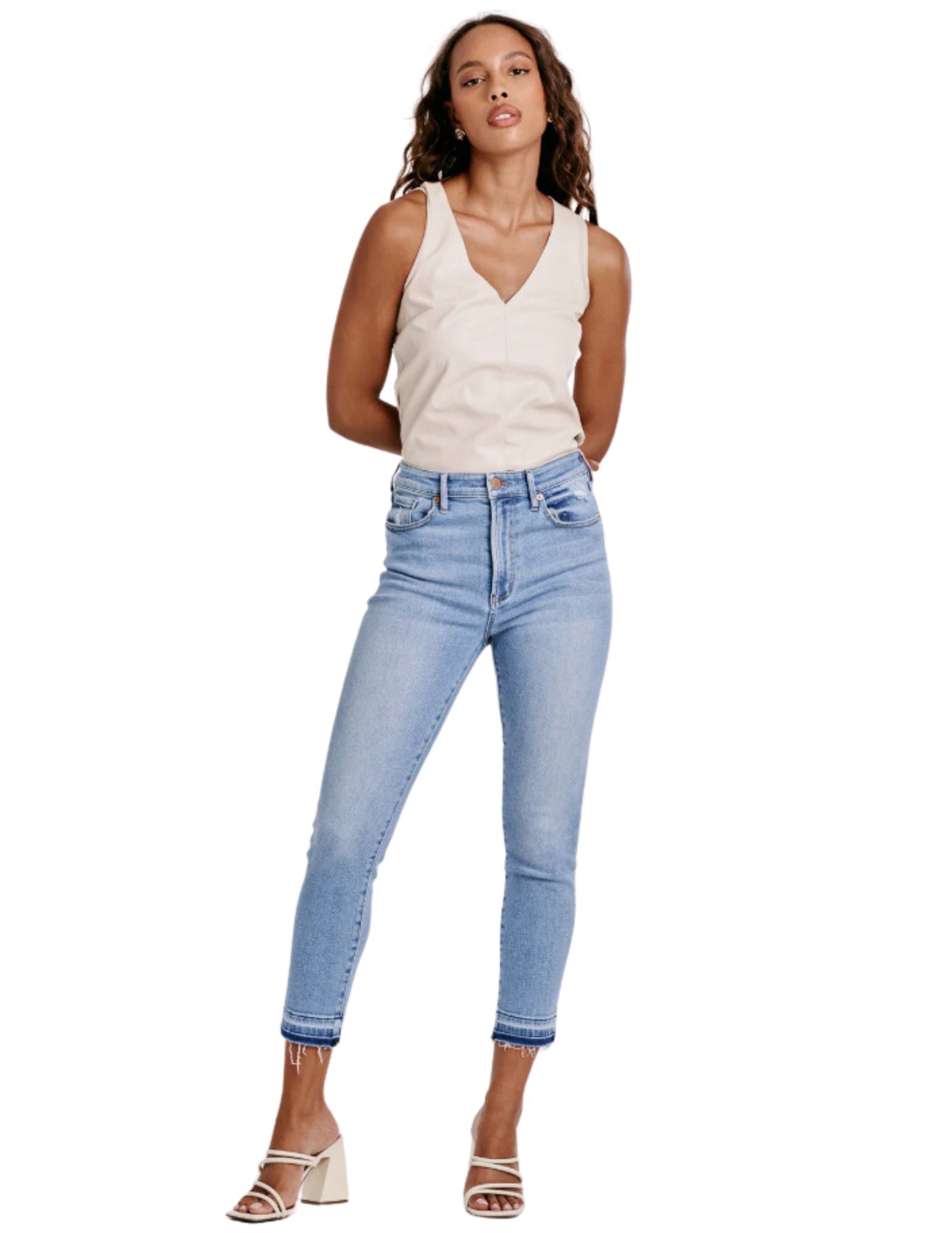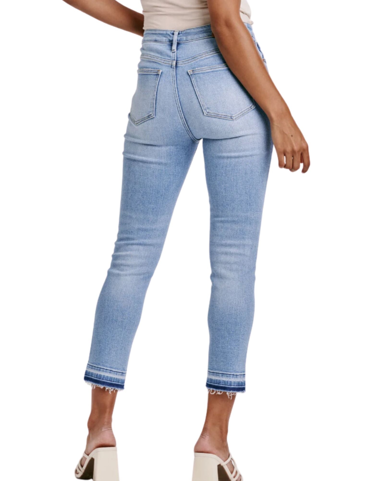 Super high rise cropped slim straight jeans. Look no further than the groovy fit, the stylish & comfort choice sitting at natural waist and fits slender from hip and thigh with lightly tapered leg. Cropped inseam on stretch denim accented with hand sanding hip & back knee whiskers, pocket destructions & grindings, tonal step hem with cut-off details, washed for buttery softness.