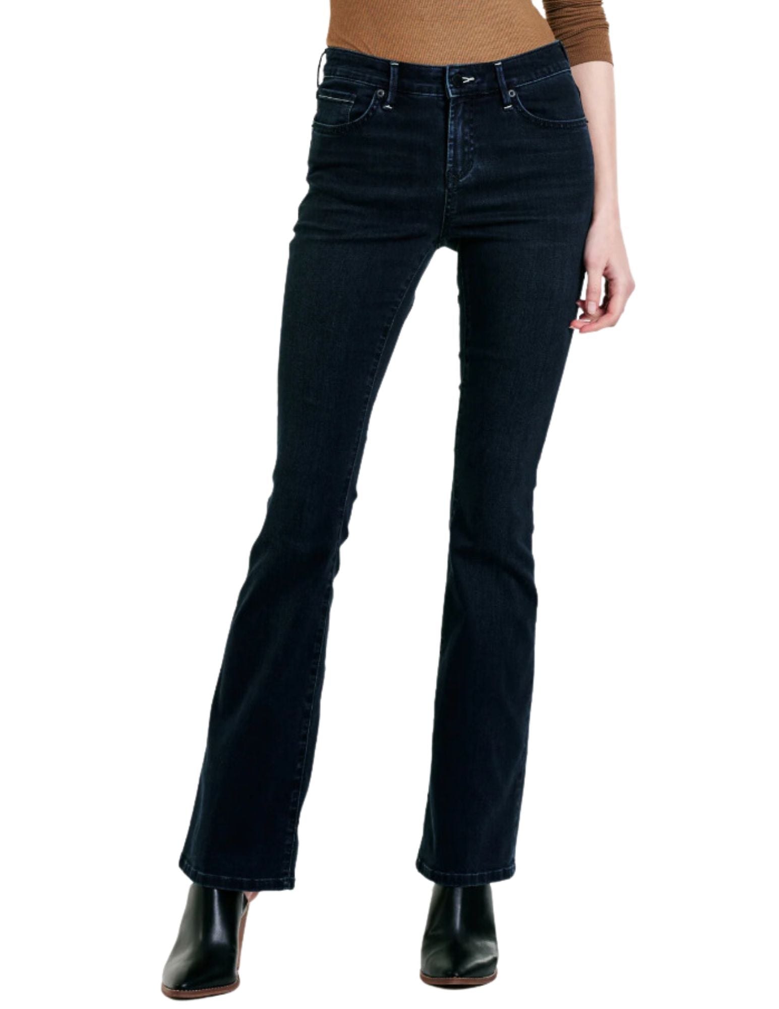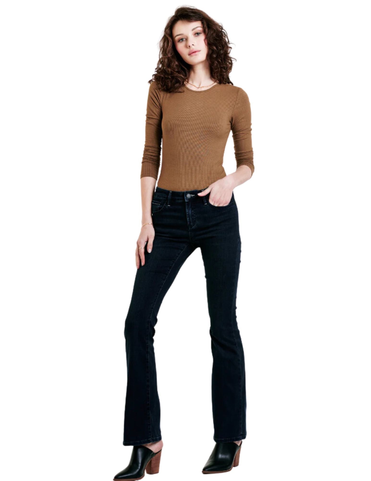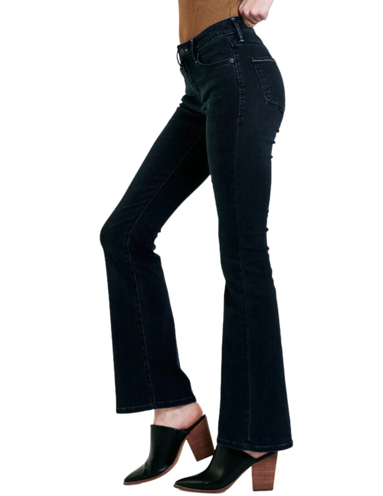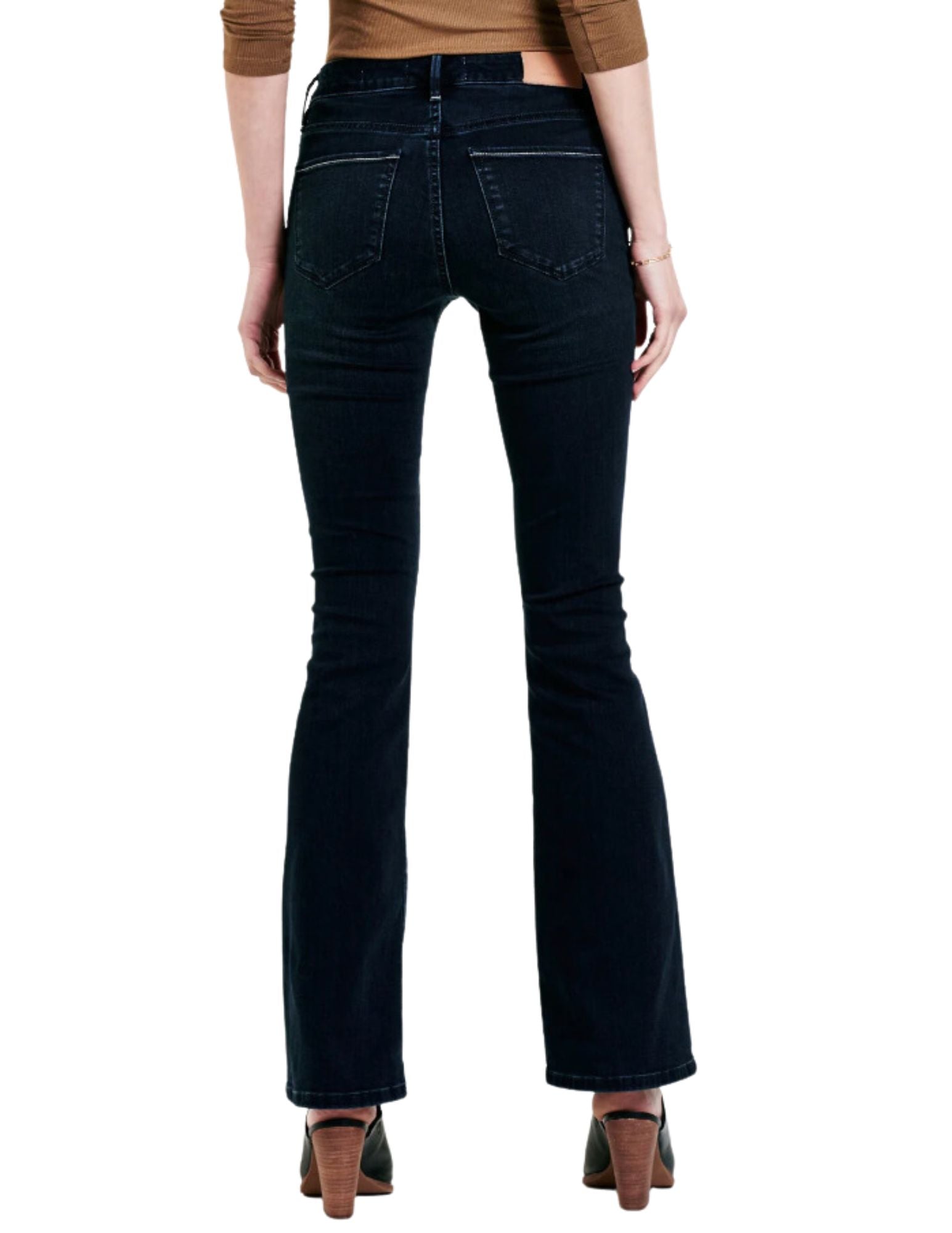 High rise bootcut jeans. It's the spirited fit that sits slightly lower on the waist and fits skinny in the hips and thigh. Full inseam on black weft super stretch denim in rich indigo shade accented with hand sanding hip whiskers, contrast stitching at back pocket hem & button opening, tailored press center seam lines.