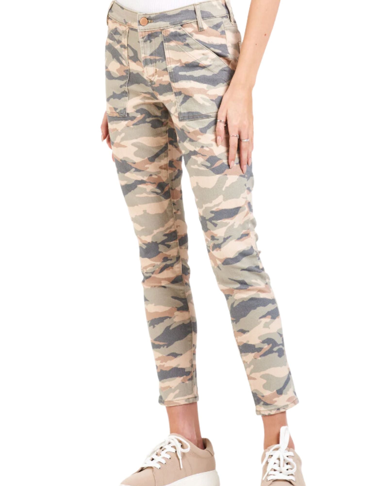 High rise ankle skinny pant. It's the stunning fit that sits slightly lower on the waist and fitted skinny in the hips through the leg. Ankle inseam on stretch twill accented with camo print and washed softness.