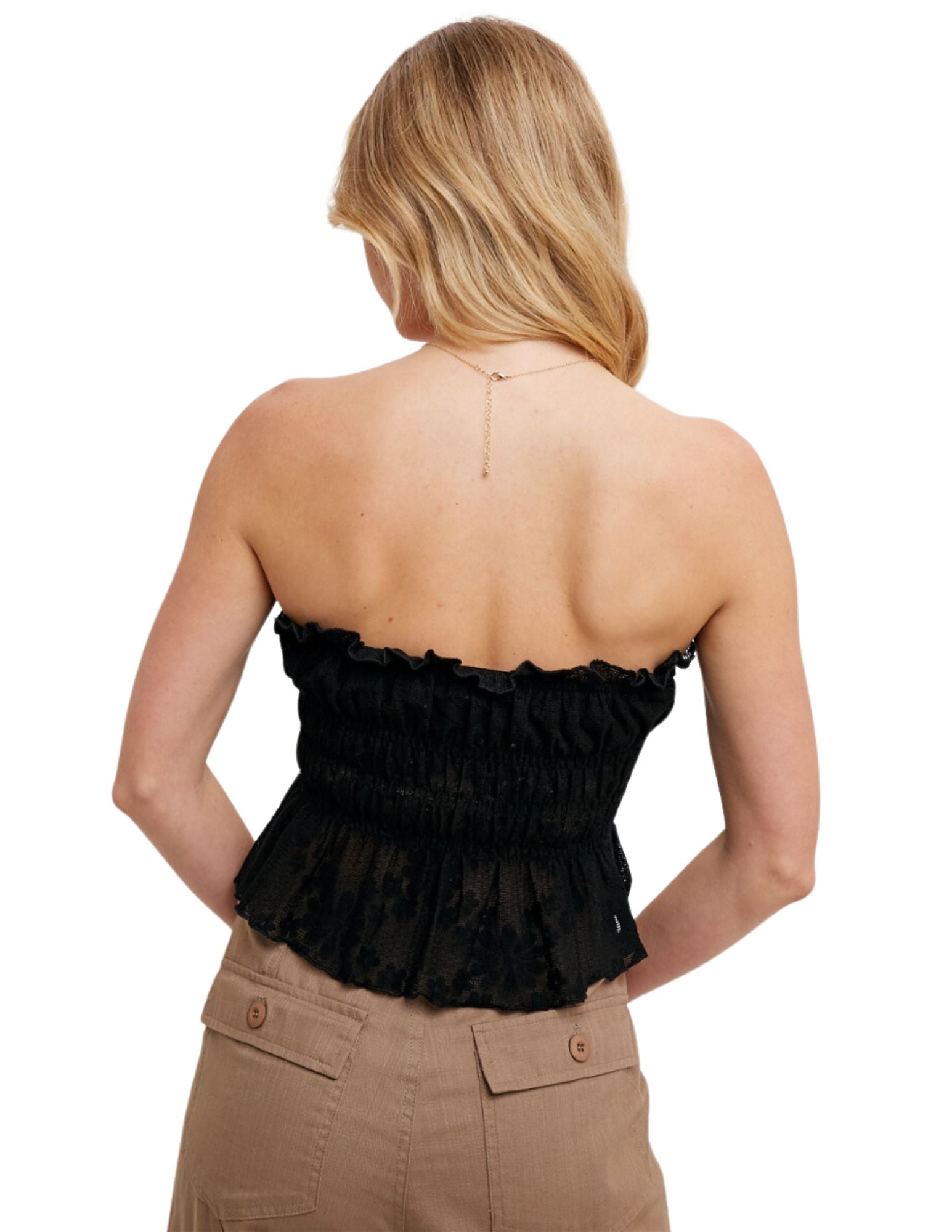The lace tie-front smocked tube top exudes a charming and feminine vibe. Crafted with delicate lace fabric, this top features a flattering smocked bodice that accentuates your silhouette. The tie-front detail adds a playful touch, allowing you to adjust the fit to your liking. The tube top style highlights your shoulders and collarbone, creating a flirty and stylish look. Perfect for warm days or special occasions, the lace tie-front smocked tube top pairs effortlessly with skirts, shorts, or high-waisted pants, making it a versatile and chic addition to your wardrobe.