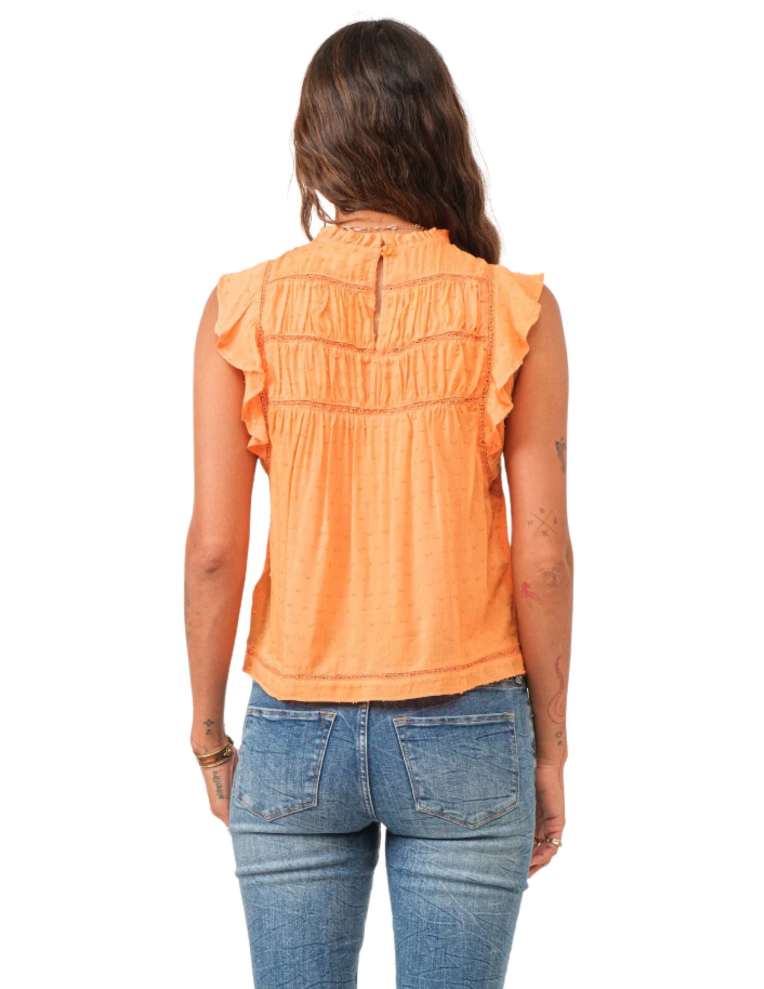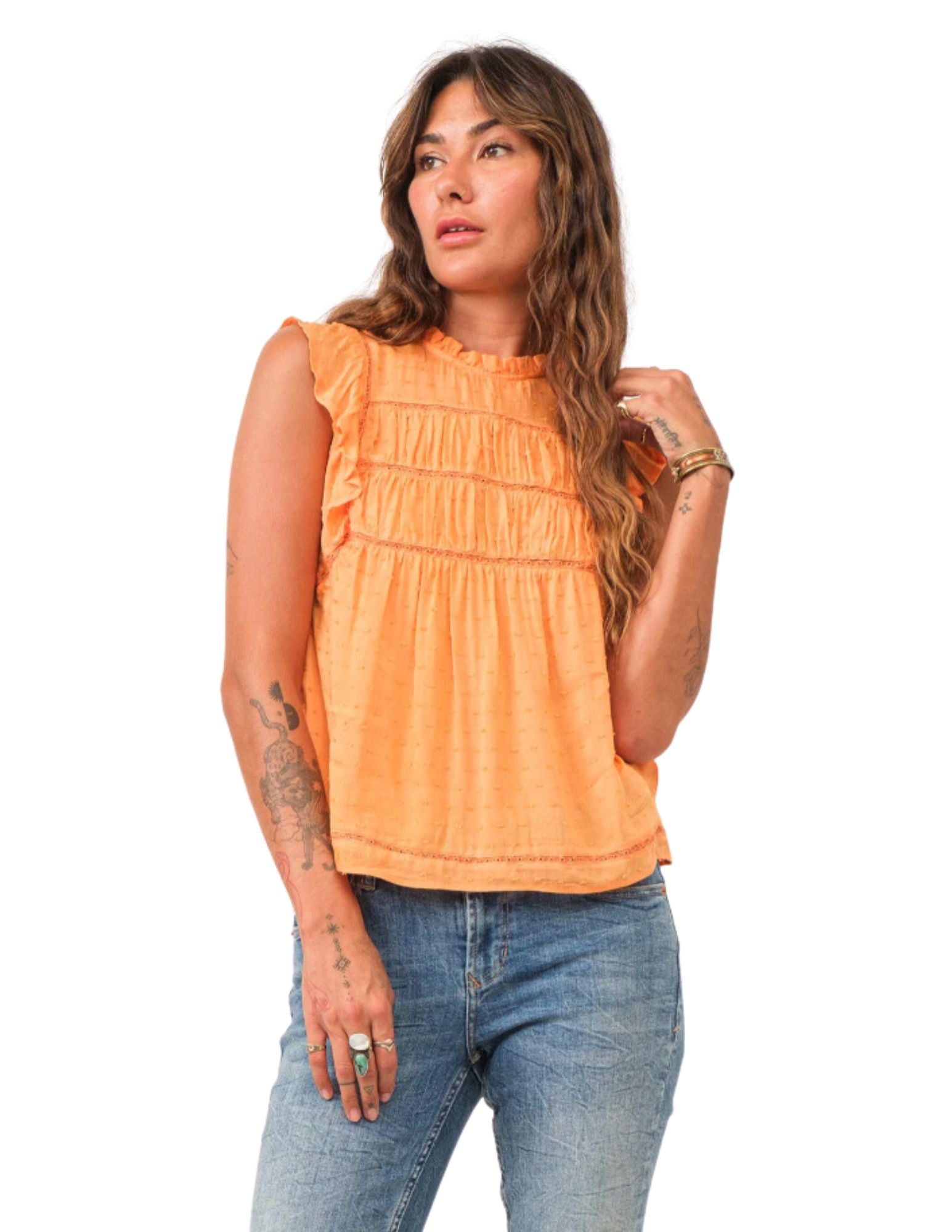 Back keyhole top, ruffle crew neck accessorized with lace trims at neck & yoke panel finished sleeveless with petal armhole in pointelle woven. Solid color woven on relaxed fit. Inspiring feminity in timeless design, embracing the spotlight the epitome of trendiness...