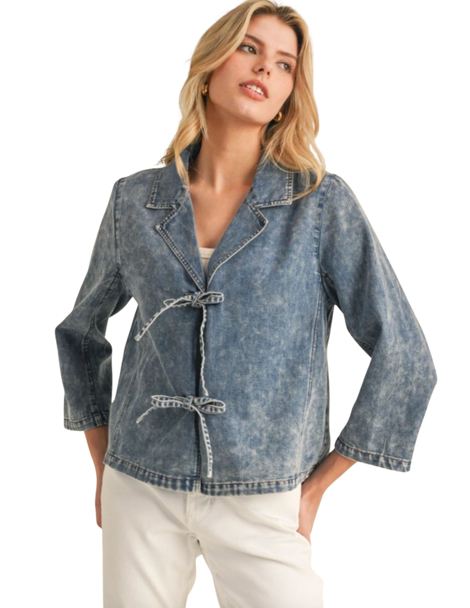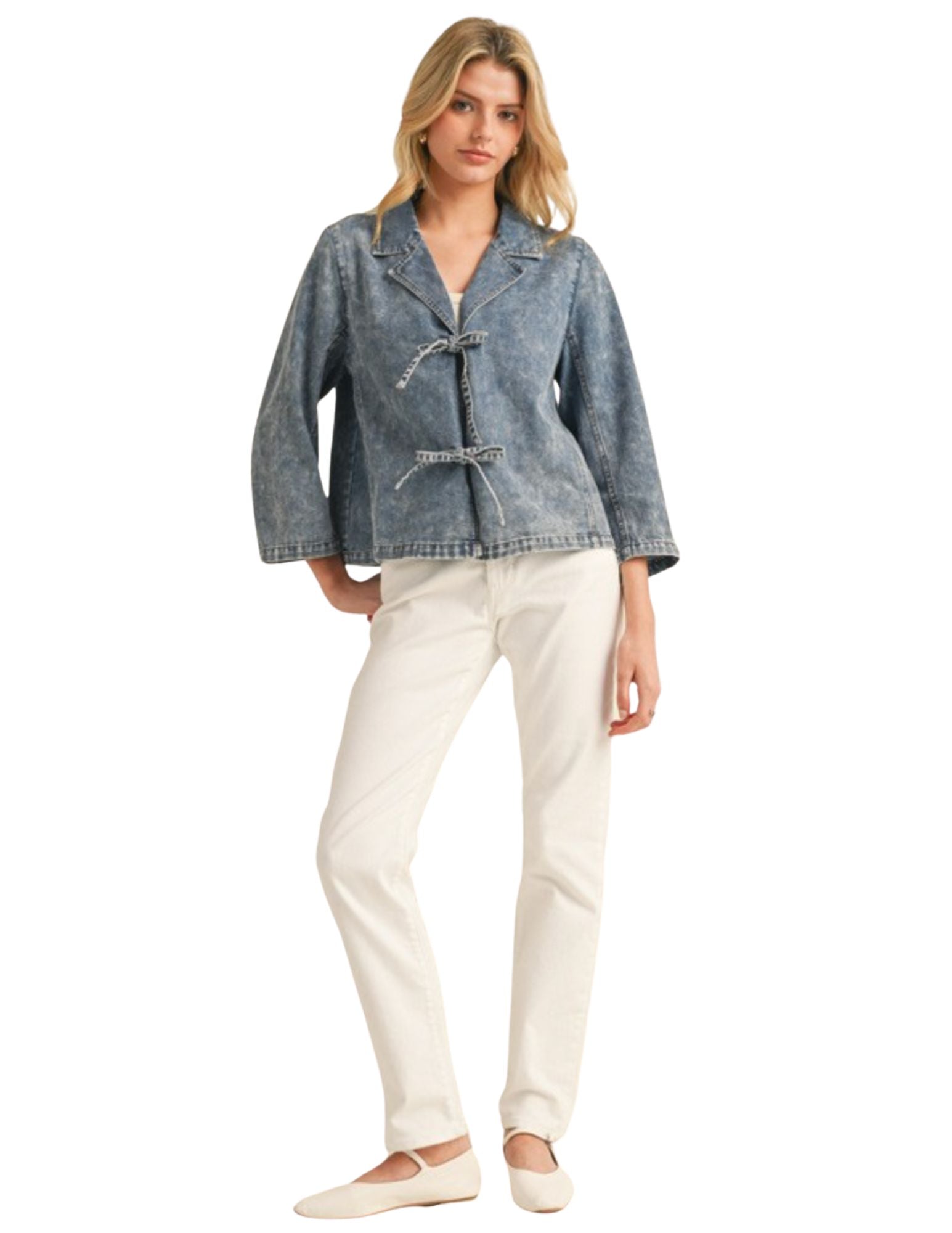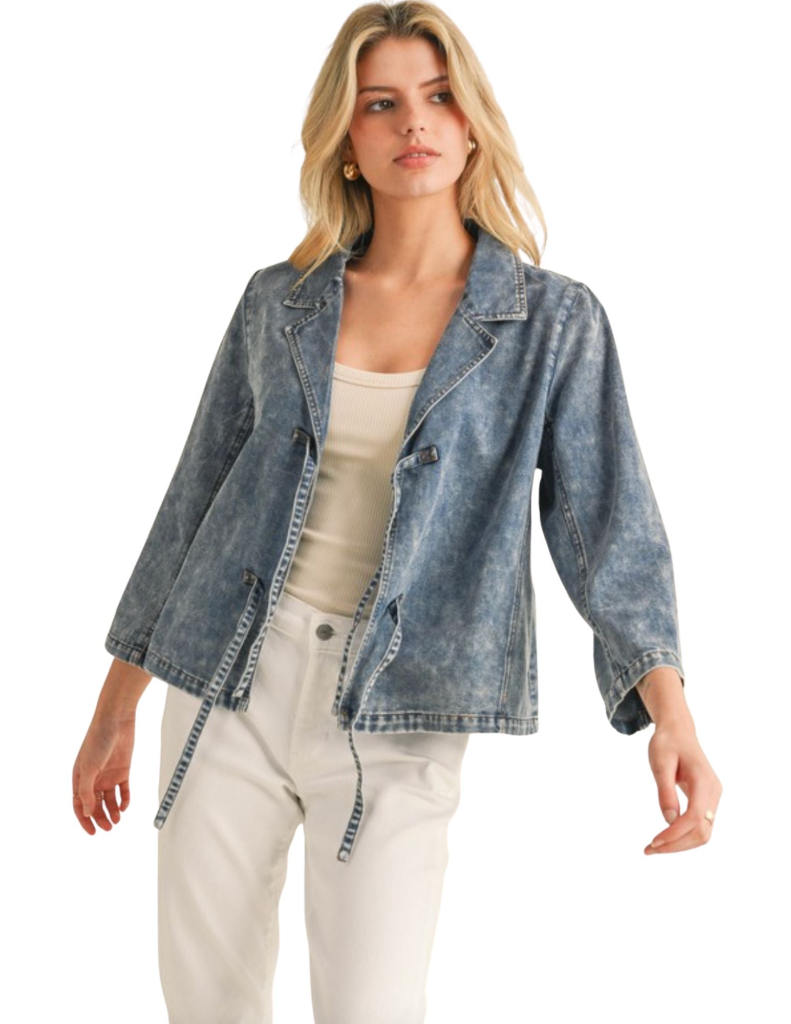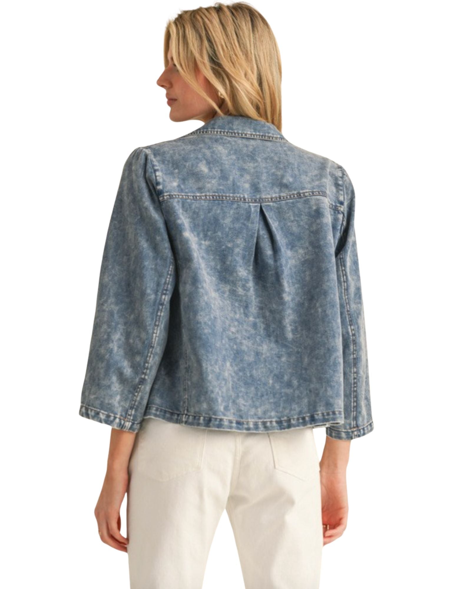 Washed denim cotton jacket with notched collar neck, front buttoned closure, back inverted pleats, and three quarter sleeves.