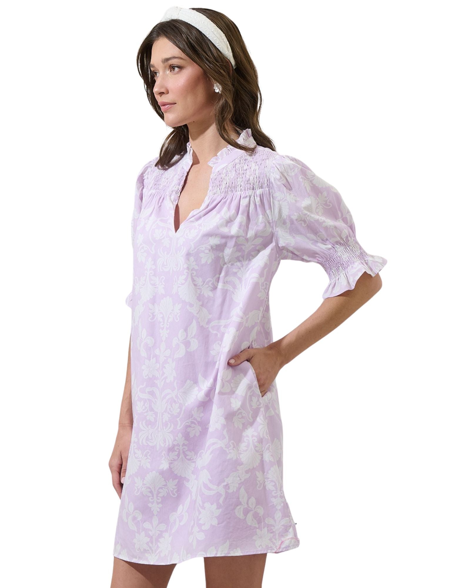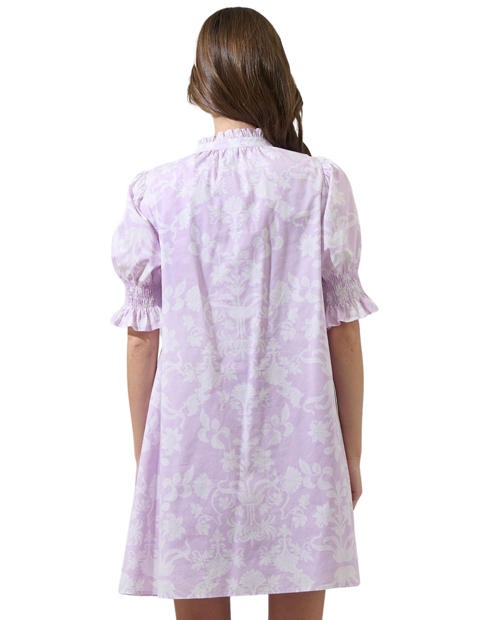 Be the cutest chic wherever you go, wearing the Emme Floral Hera Shift Mini Dress. A lavender and white gorgeous floral print design this mini dress with smocked short sleeves, split neckline and ruffles. Dress it up with strappy sandals or heels. - Split neck - Floral - Shift - Smocked short sleeves