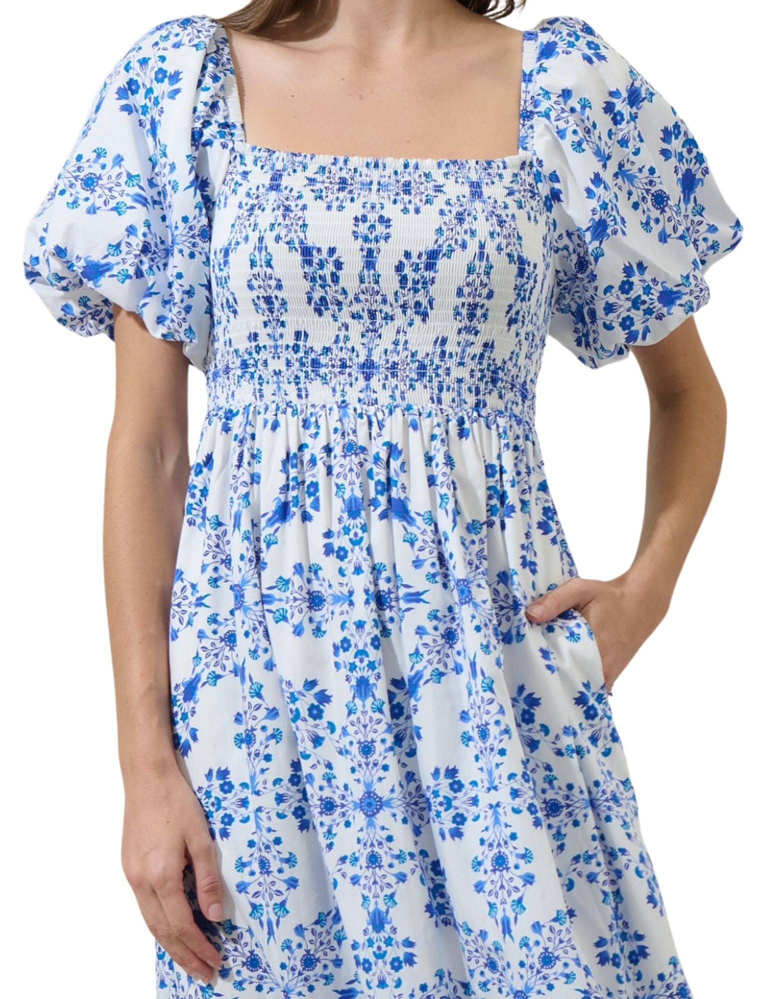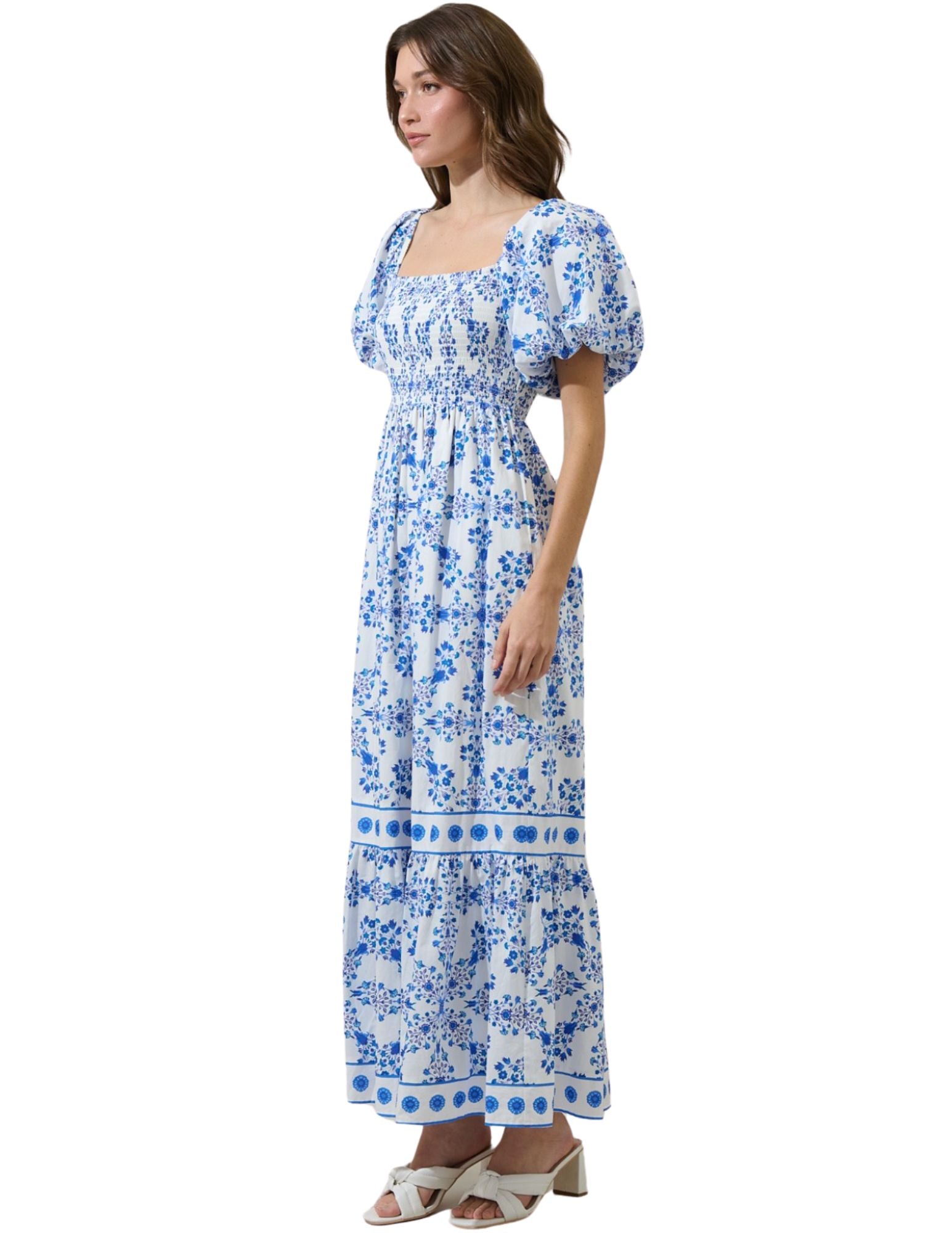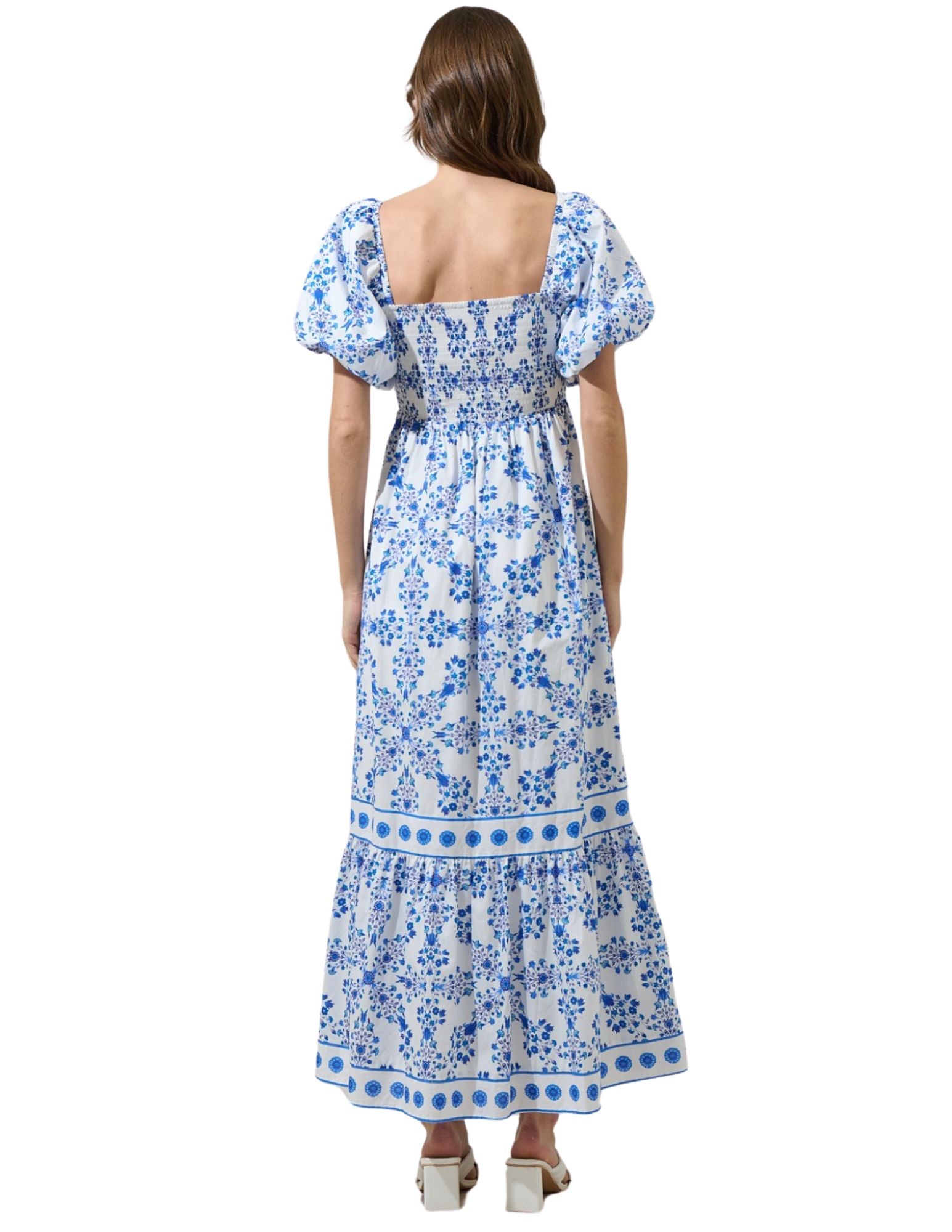 Let your looks do the talking. The beautiful Veral Floral Berky Smocked Maxi Dress features short bubble sleeves, a square neckline, and with a front and back smocked bodice. It has a loose fit with a border tier in the bottom. Keep the look cute with heels. - Smocked - Short bubble sleeve - Square neck - Floral