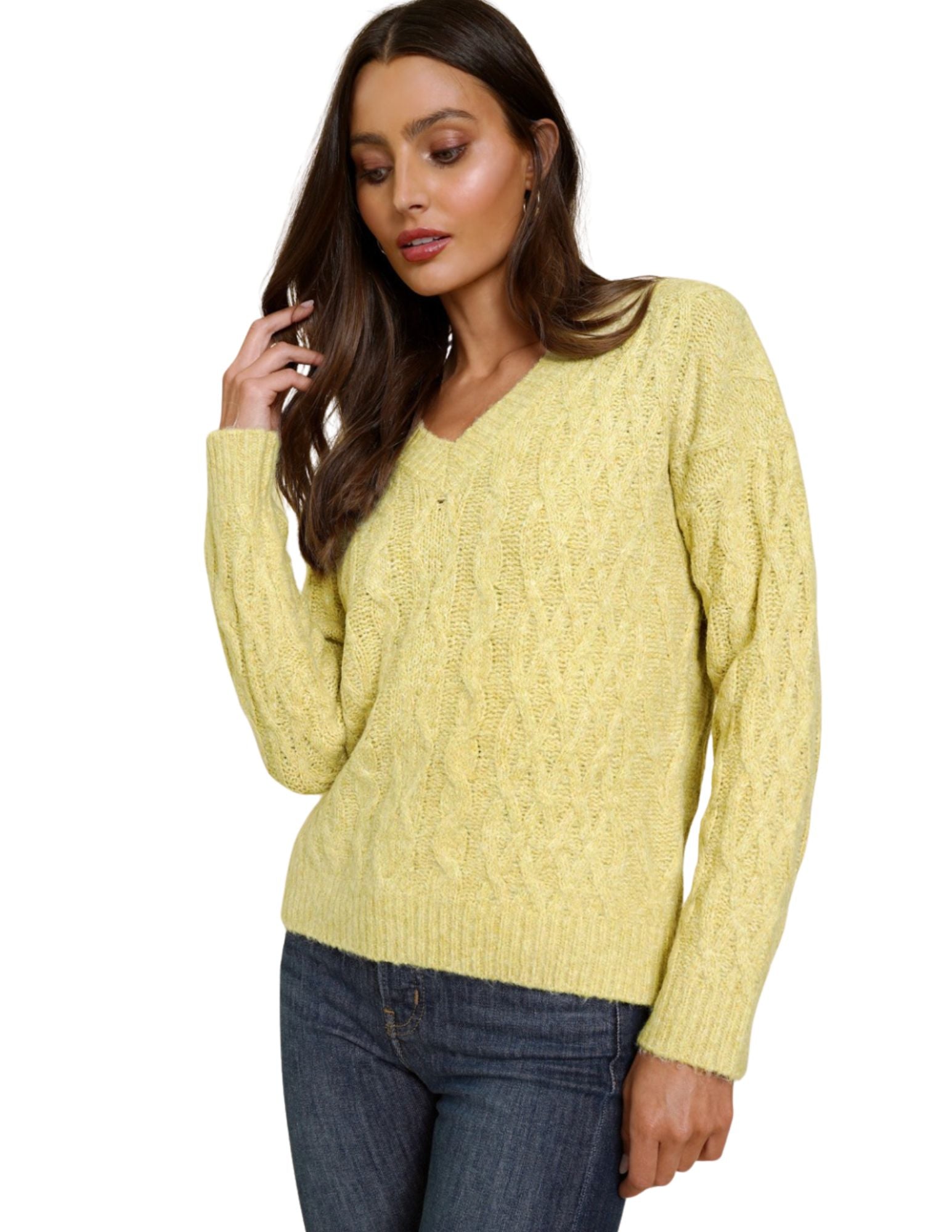 Melange Cable Weave Sweater Melange yarn Ribbed V-neckline