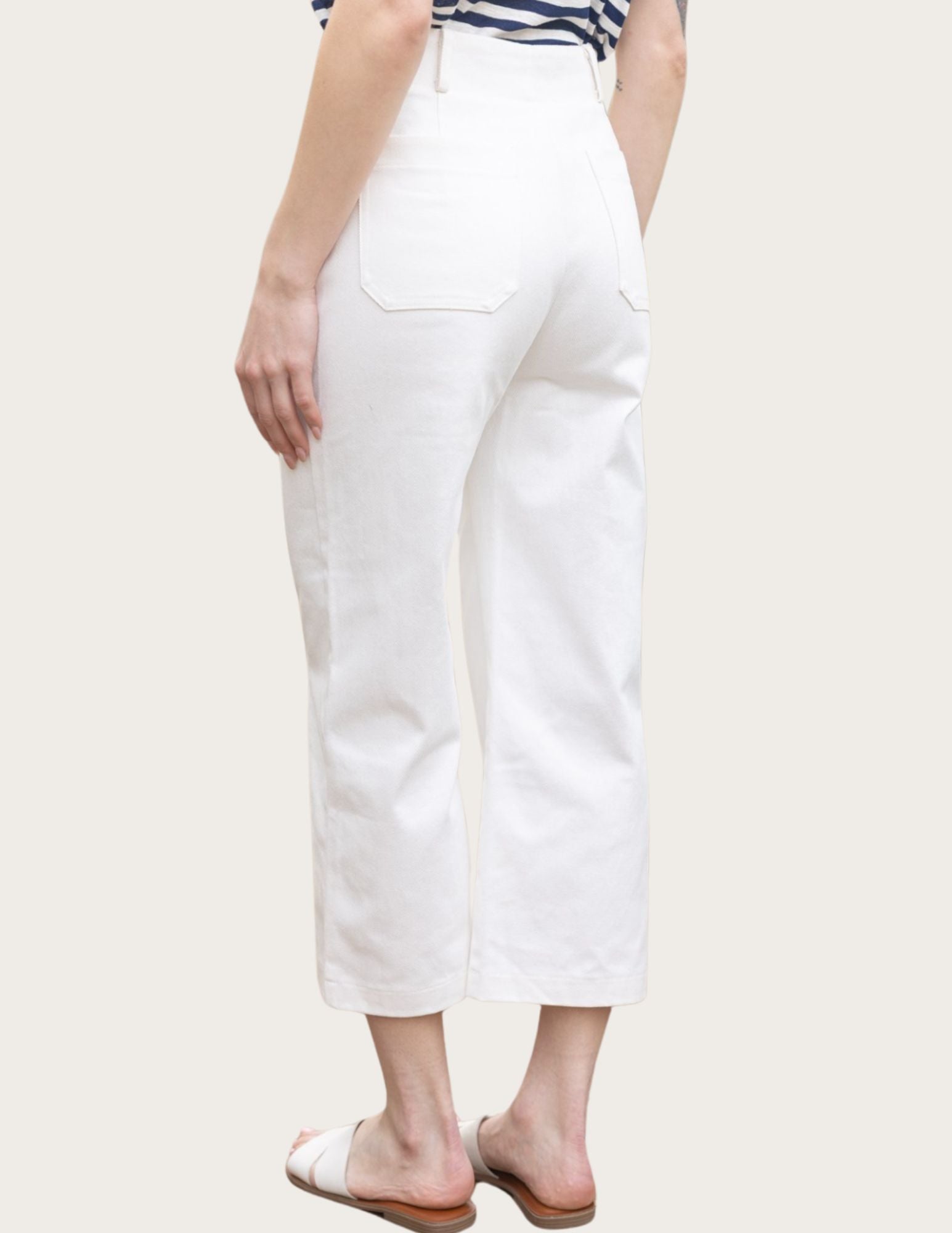 - Gold button closure with zip fly - Double pockets in the front and the back - Wide crop style - Medium weight colored jean fabric