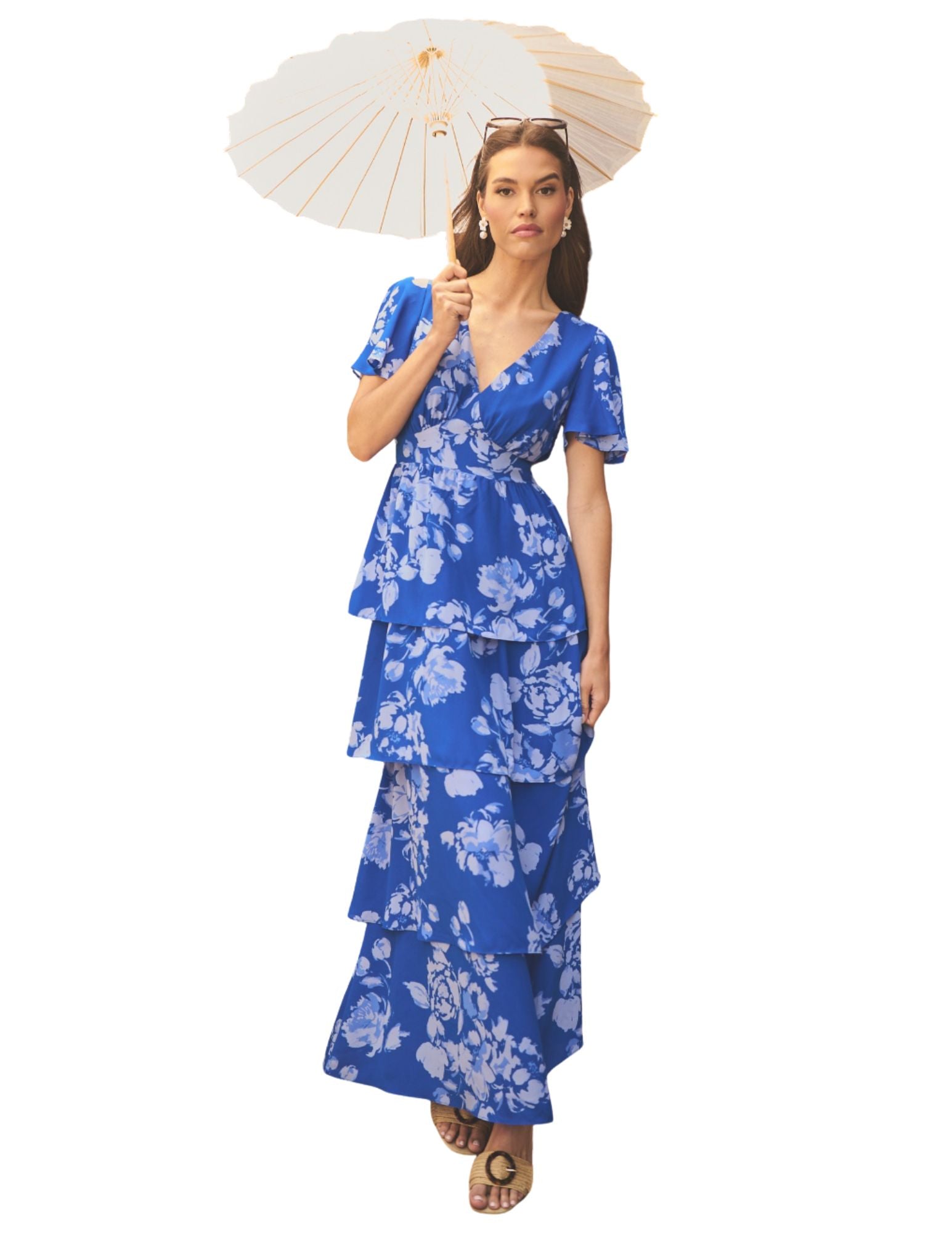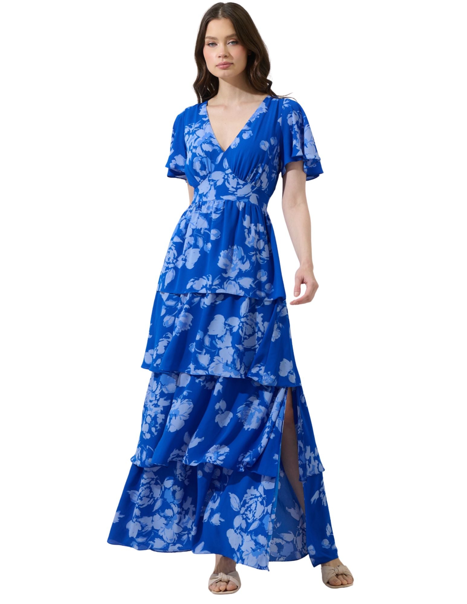 Cultivate a look that will net you all the compliments! This floral-patterned maxi features a deep v-neck, short sleeves, and a tiered design with a smocked back for a flattering silhouette. Style it with block heels and a delicate clutch for a polished finish.