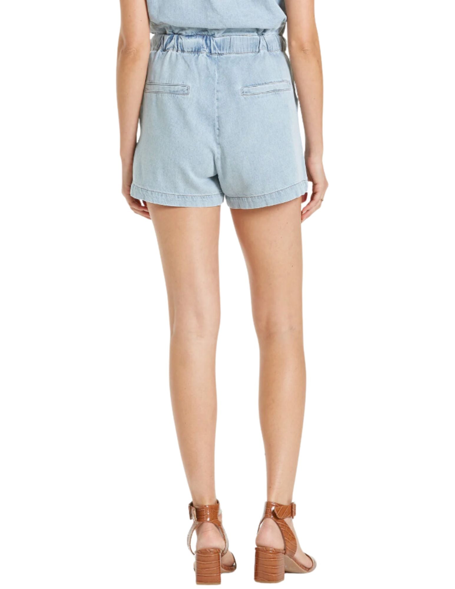 Relaxed paperbag cargo super high rise shorts. It's the true fit that sits at natural waist and fitted in the hip and thigh. Shorts inseam on chambray denim (non-stretch) vintage washed accented with waist ruffles, elastic waistband & self tie, designer cargo & welt pockets.